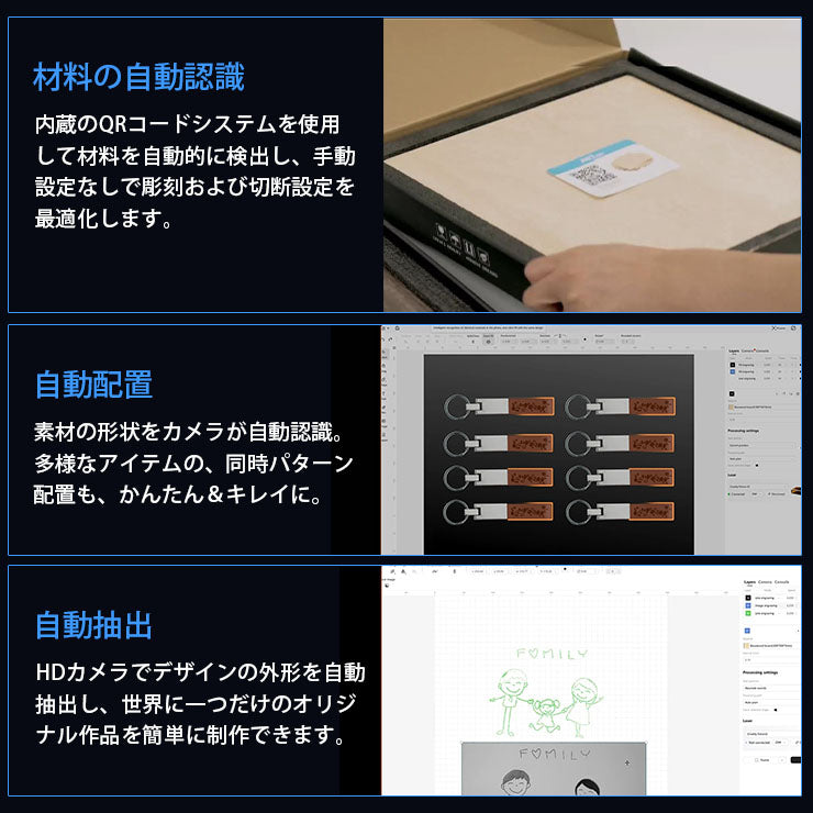 対応素材:段ボール、木材、竹、ゴム、革、布、アクリル、プラスチックなど