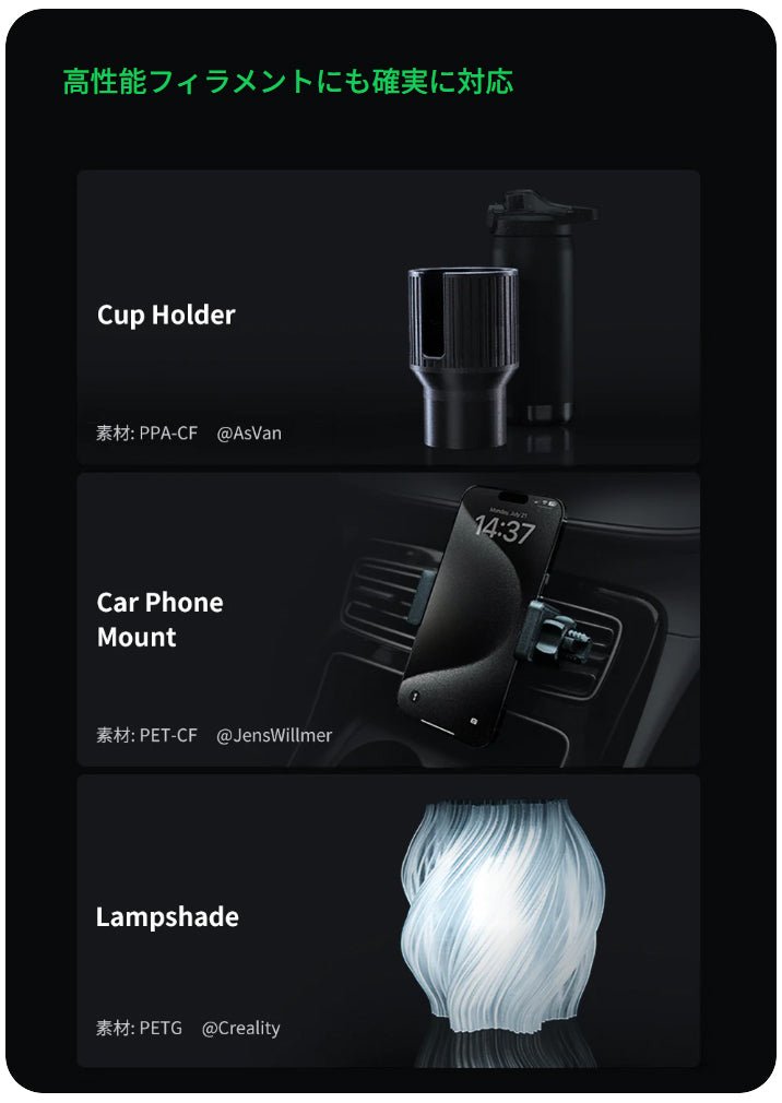 対応フィラメント:PLA / PETG / PET / ABS / ASA / PLA-CF / PA-CF / PPA-CF