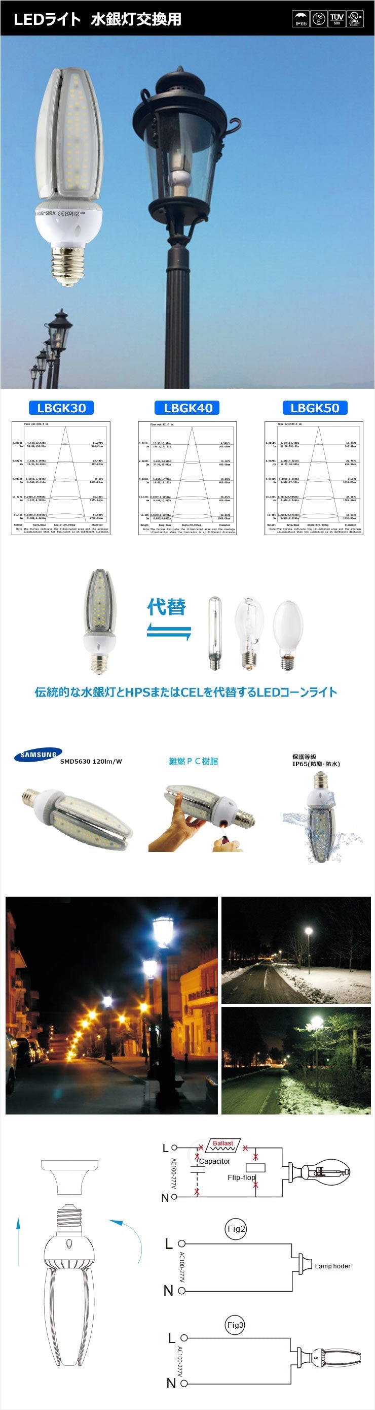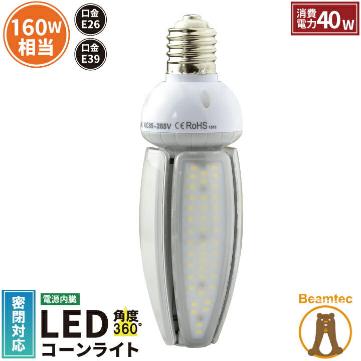 LED 水銀ランプ 160W相当 コーン型 LED電球 E26 E39 電源内蔵 防塵 防水 密閉型器具対応 LED コーンライト 照射角度360度 LEDライト 街路灯 防犯灯 水銀灯交換用 省エネ LED照明 LBGK40W 電球色